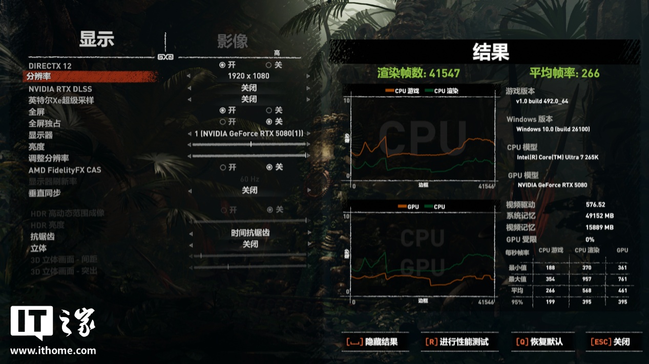 再看单机游戏的表现,在《古墓丽影:暗影》中以 1080P 分辨率 + 高画质,运行游戏自带基准测试,酷睿 Ultra 7 265K 处理器的游戏平均帧数为 266 帧,1% Low 帧为 139 帧。