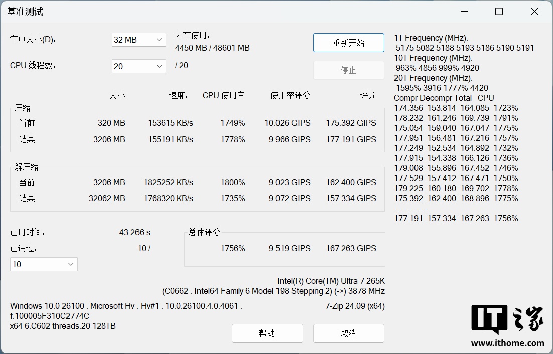首先是代表文件解压 / 压缩性能的 7-Zip 基准测试,酷睿 Ultra 7 265K 处理器的压缩项目评分为 177 GIPS,解压缩项目评分为 157 GIPS。