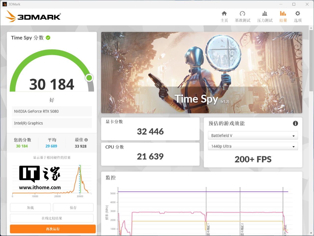 在 3D Mark Time Spy 跑分测试中,酷睿 Ultra 7 265K 处理器搭配 RTX 5080 显卡,整体得分突破 3 万大关,CPU 得分达到了 21639 分,游戏性能上的表现也不会差。