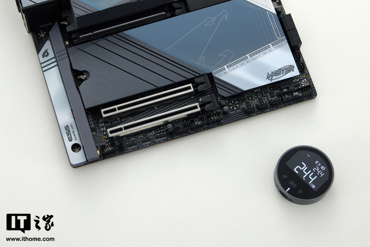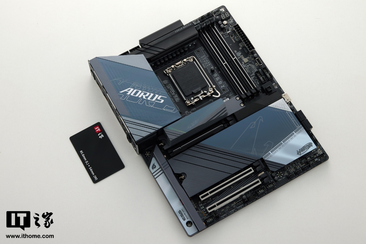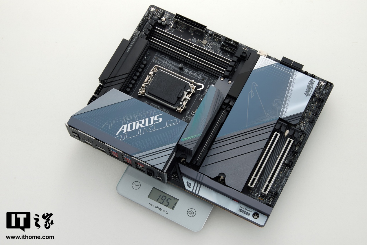 尺寸方面,经过IT之家实测技嘉 Z890 超级雕主板的长宽分别达到了 285mm*244mm,重量约 1.95 千克,可见散热装甲和 PCB 部分的用料很足。