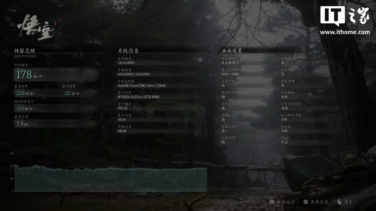 接下来是两款原生画质就拥有极大性能压力的单机大作,第一款《黑神话:悟空》,以 1080P 分辨率 + 高画质 + 50% 超采样 + TSR,运行游戏自带基准测试,酷睿 Ultra 7 265K 处理器的游戏平均帧数达到了 178 帧,1% Low 帧为 130 帧。