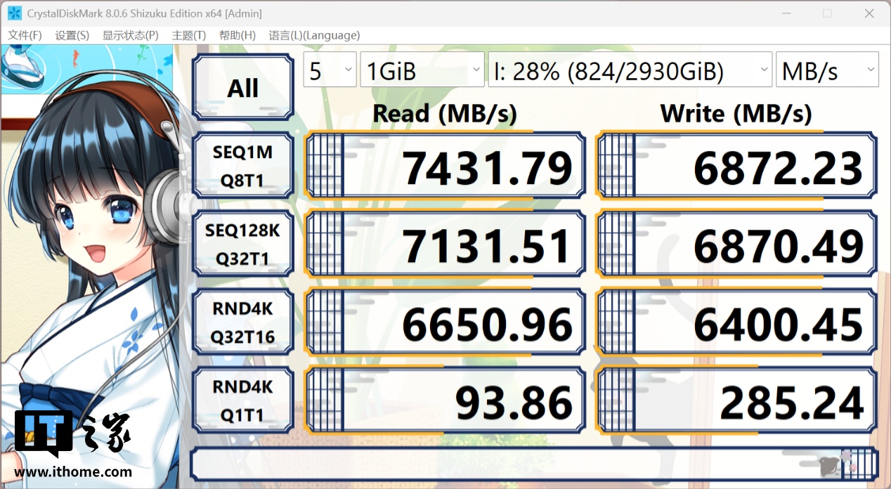 硬盘方面,技嘉 Z890 AORUS MASTER 超级雕主板配备 2 个 PCIe5.0 M.2 插槽和 3 个 PCIe4.0 M.2 插槽,存储扩展给到了旗舰规格。目前我们手上暂时没有 PCIe Gen 5.0×4 规格的固态硬盘,因此就用 PCIe Gen 4.0×4 规格的三星 990 PRO 4TB 版本进行实测,读写跑分成绩如图所示,基本能够跑满官方标称的读写速度。
