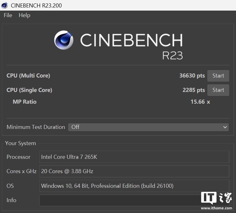 在 CineBench R23 的测试中,酷睿 Ultra 7 265K 处理器跑出了单核 2285 分,多核 36630 分的成绩,放在 Z890 主板中也是靠前的表现。