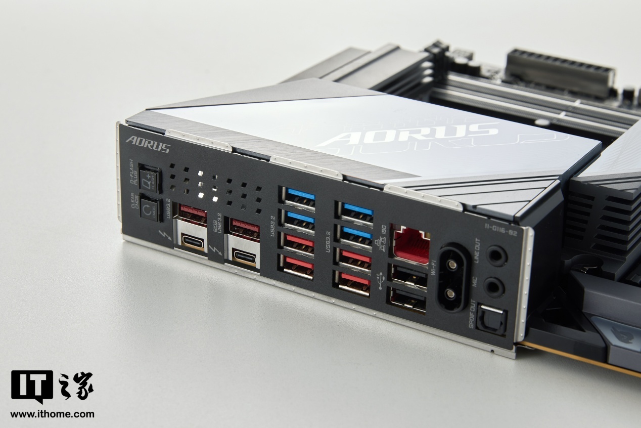 主板侧边的 I/O 接口区域,技嘉提供了 Clear CMOS + Q-Flash Plus 按键组,14 个 USB A 接口和 2 个雷电 4 协议的 USB C 接口,RJ45 10G 网口,无线 WiFi 天线接口以及最下面 SPDIF OUT 为首的音频接口组。