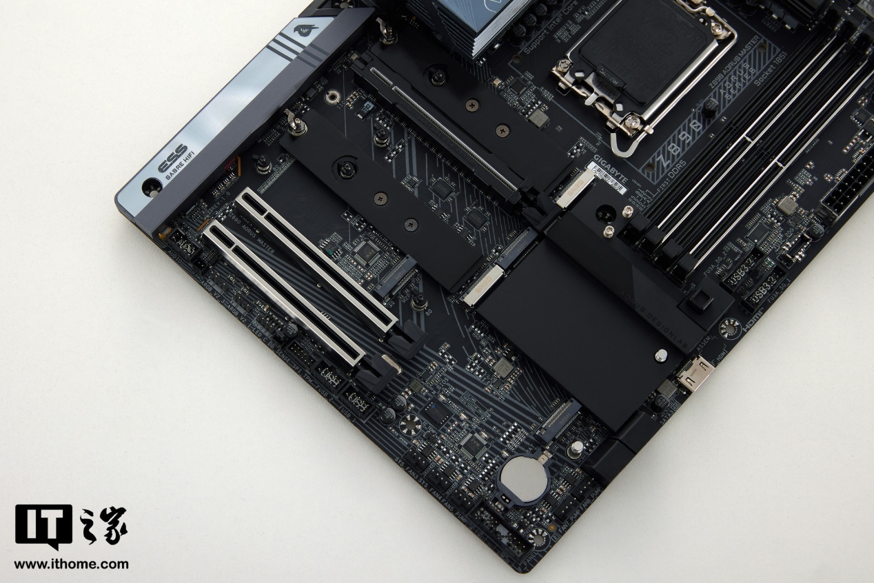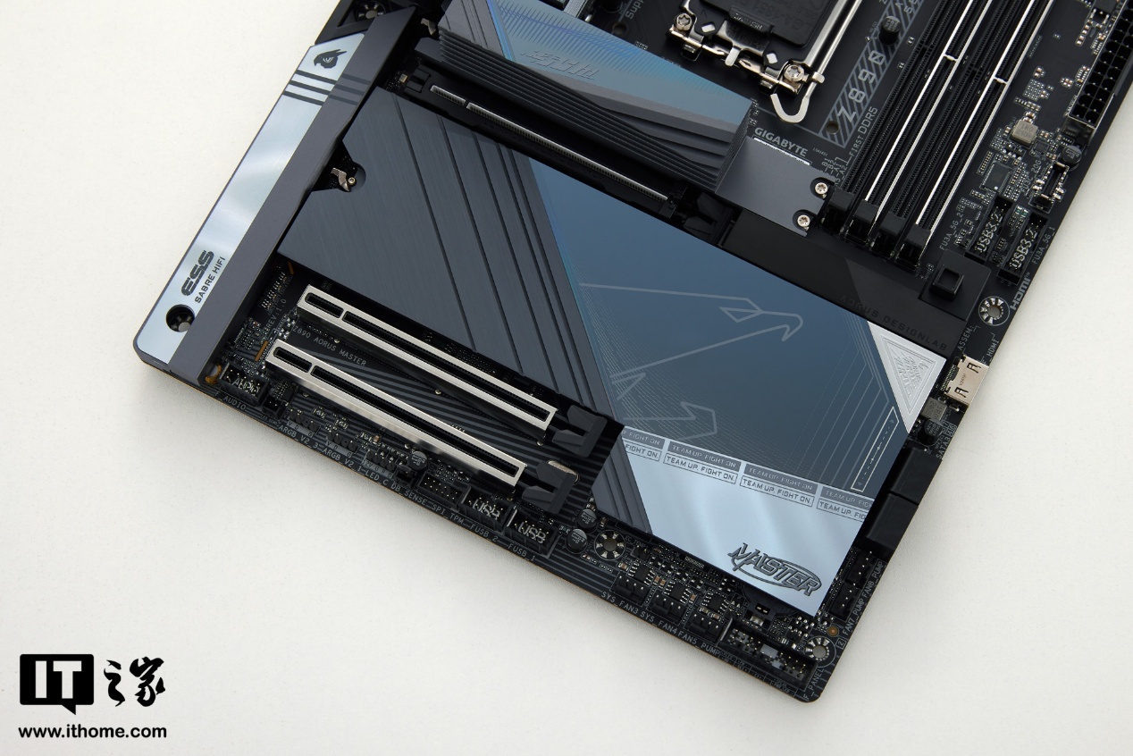 揭开下半部分的散热装甲后可以看到,技嘉 Z890 超级雕主板一共配有 2 个 PCIe5.0x4 规格 M.2 插槽(主硬盘位和扩展区左数第二硬盘位)和 3 个 PCIe4.0x4 M.2 插槽,1 条黑化铝合金加固的 PCIe5.0x16 显卡插槽,2 条银色铝合金加固的 PCIe4.0x16 插槽,细节处理毫不含糊。