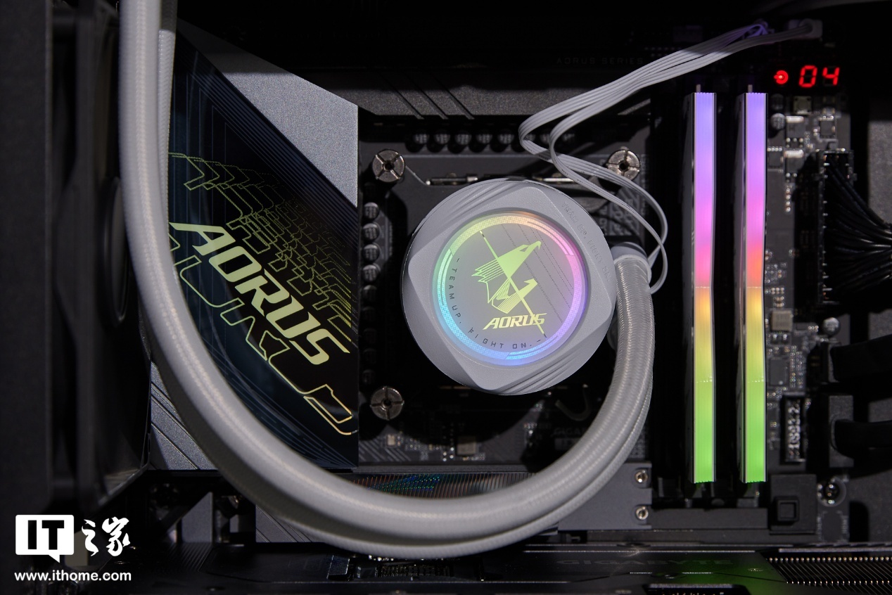 亮机后可以看到,左侧散热装甲上的 AORUS 艺术字 Logo 部分应用了无限镜风格的 RGB 灯效,右上角的电源快捷按钮、数显 DeBug 灯均变为红色,进一步增强电竞风格和辨识度,纠错灯和快捷电源按钮也易于辨认。