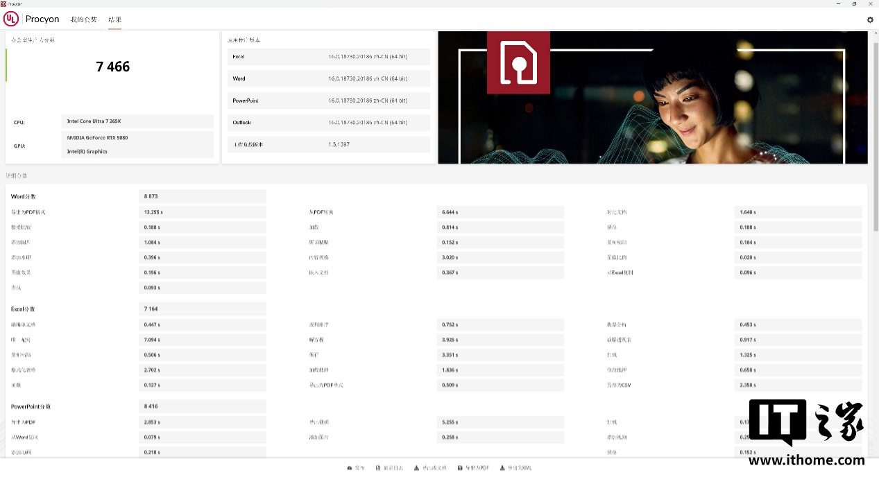 在考验 CPU 基础办公性能的 UL Procyon Office 办公基准测试中,酷睿 Ultra 7 265K 处理器的 CPU 综合分数为 7466 分,其中 Word 项目分数 8873 分、Excel 项目分数 7146 分、PowerPoint 项目分数 8416 分。