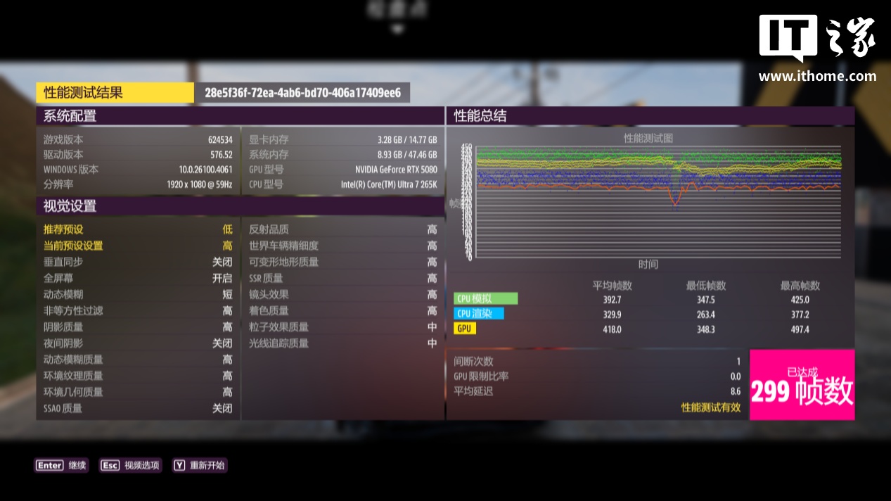 《极限竞速:地平线 5》作为代表性很强的赛车游戏,以 1080P 分辨率 + 高画质运行游戏自带基准测试,酷睿 Ultra 7 265K 处理器的游戏平均帧数达到了 299 帧,1% Low 帧为 208 帧。