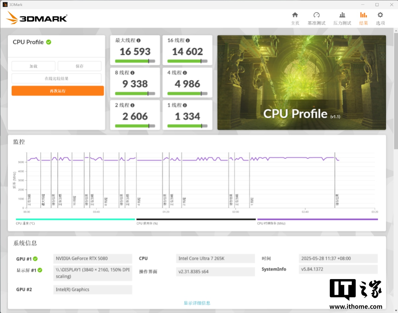 在 3D Mark CPU Profile 的测试中,酷睿 Ultra 7 265K 处理器的最大线程分数为 16593 分,单线程分数为 1334 分,单核性能相比前代提升明显,多核性能的表现也不错。