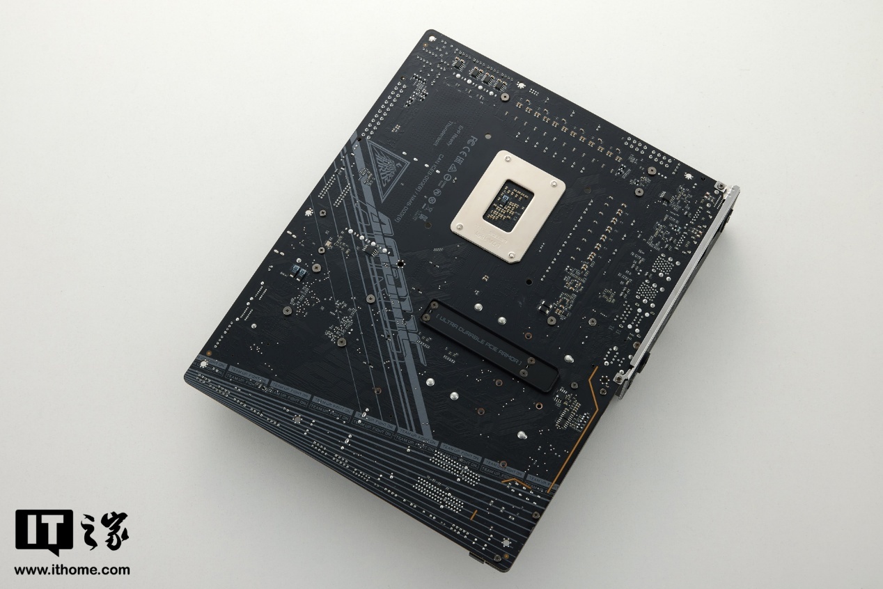 主板背面的设计相对简洁,元器件触点工整,并通过两条斜切装饰简单点缀。