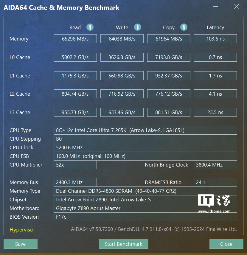 读写拷贝速度均超过 60000MB/s,这个成绩显然是属于 4800MHz 频率的内存在 Z890 旗舰主板上的表现,不过内存延迟是有点高的,达到了 103.6ns。