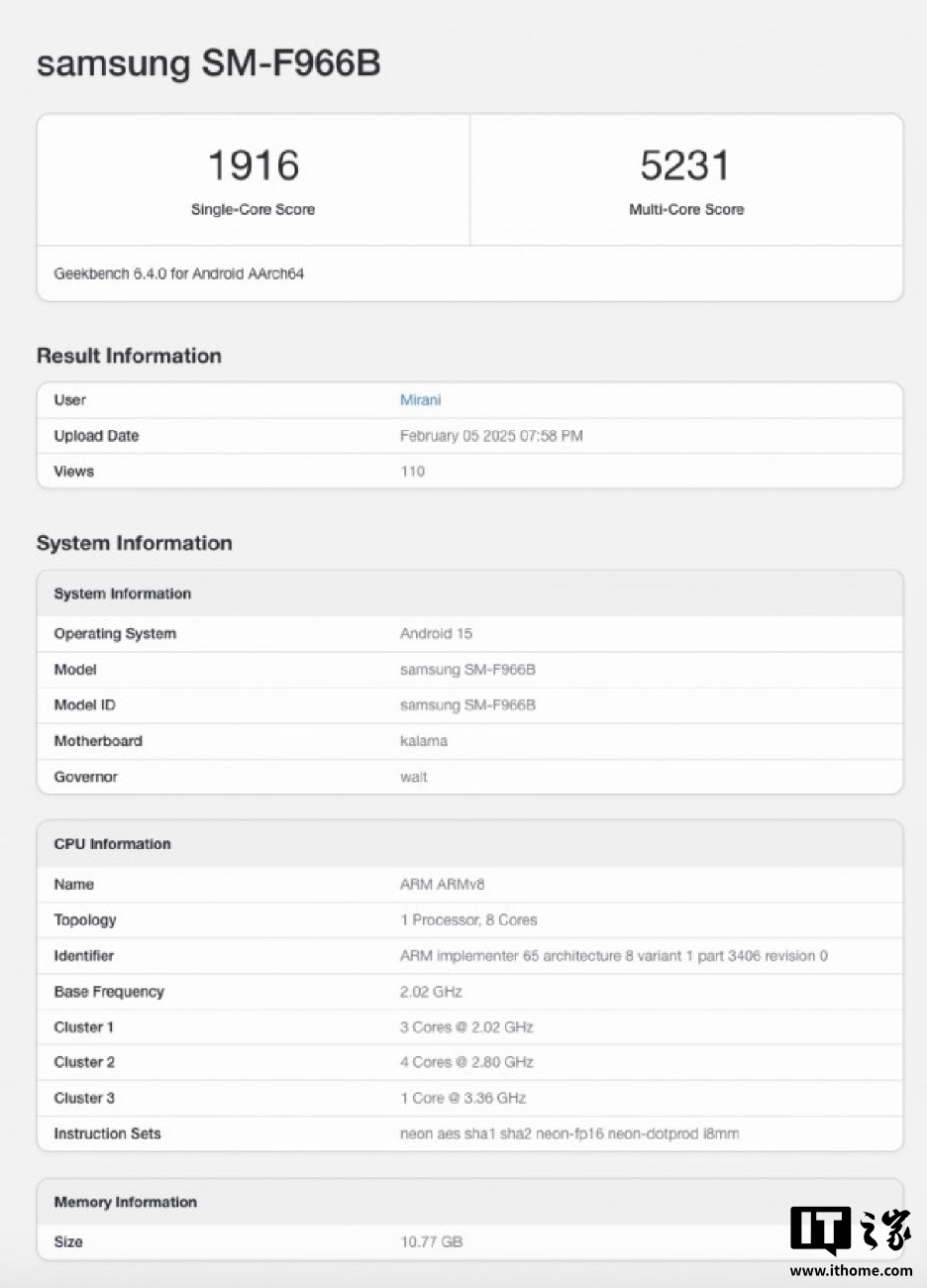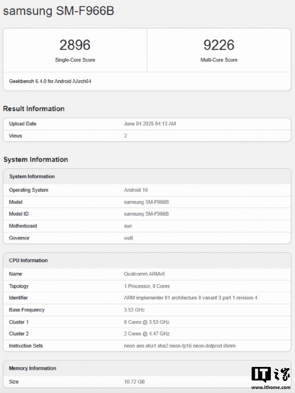 IT之家 6 月 4 日消息,一款型号为 SM-F966B 的三星新机今日现身 Geekbench 跑分数据库,该机预计为 Galaxy Z Fold7 全球版,多核跑分最高 9226 分