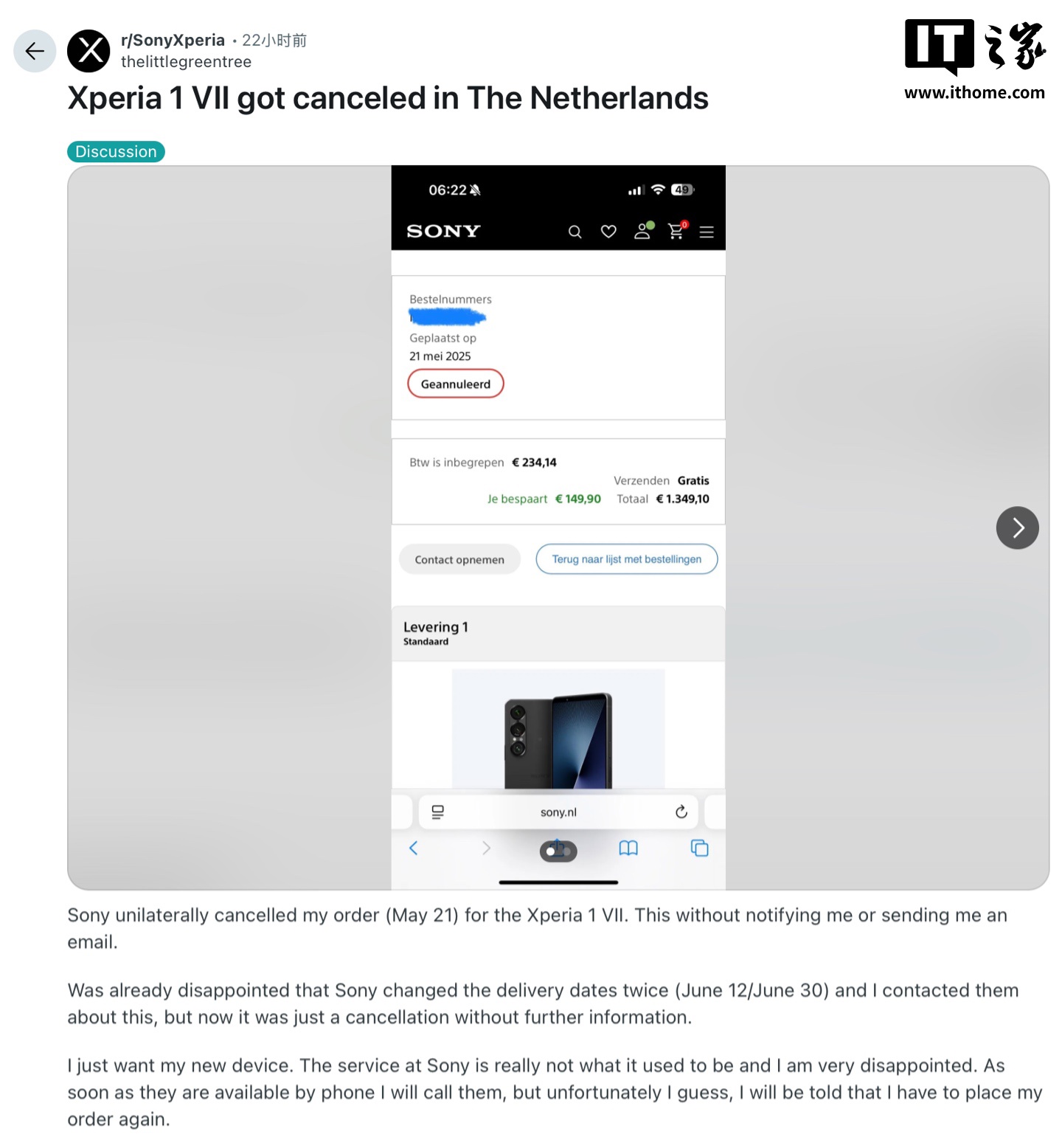 目前,这类投诉遍布欧洲多国家,涉及荷兰、德国、英国、法国等市场,但索尼官方尚未就此事发表任何说明,这也使得用户只能自行猜测原因,部分用户认为可能是索尼商品系统出错,也有可能是该公司低估了 Xperia 1 VII 的市场需求,从而导致产能 / 库存跟不上,因此选择砍单。