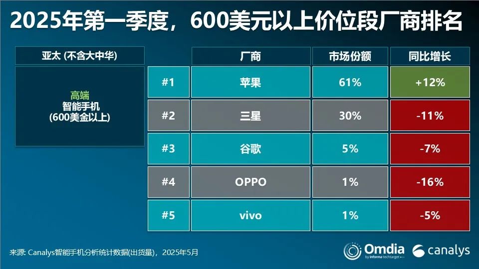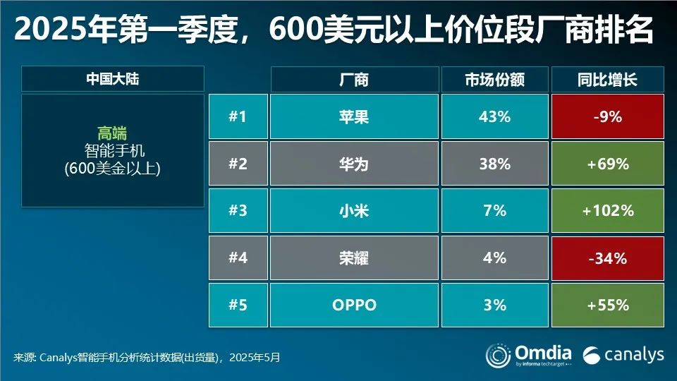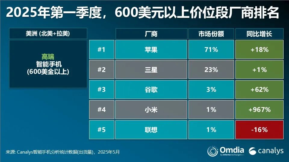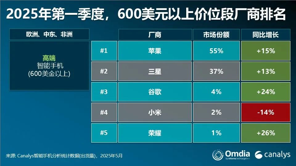 苹果在复杂多变的关税政策到来前积极实施备货,在一季度同比增长 10%,以 59% 的份额位居高端市场榜单第一。