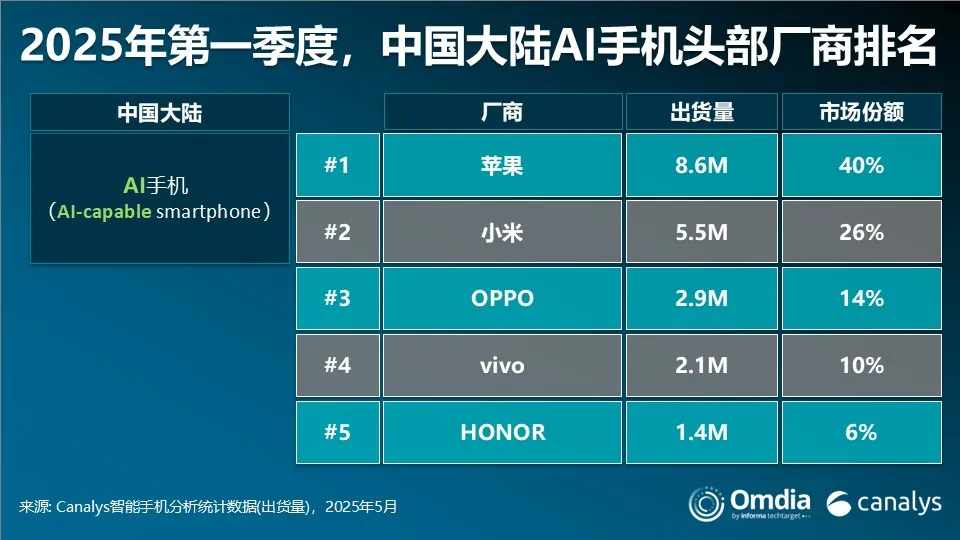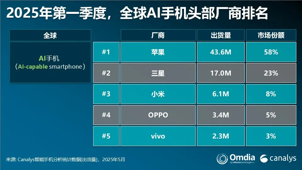 今年 Q1 全球 AI 手机头部厂商排名如下:
