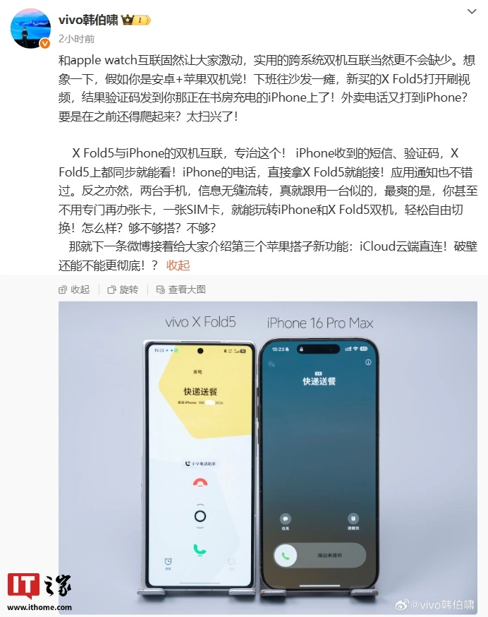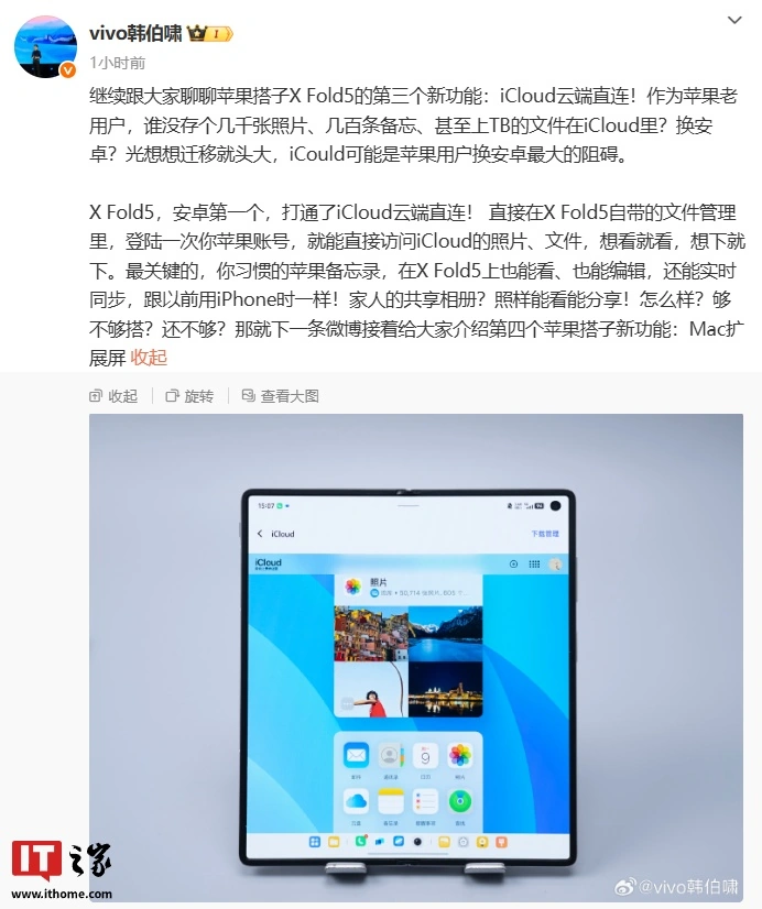 IT之家 6 月 10 日消息,vivo 通信科技有限公司产品经理韩伯啸今日发文宣布,vivo X Fold5 折叠屏新机将成为安卓第一个打通了 iCloud 云端直连的机型
