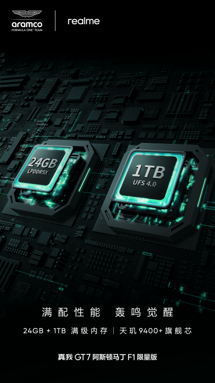 核心配置上,真我GT7阿斯顿马丁 F1 限量版采用了 24GB+1TB 满级大内存,搭载最新 3nm 天玑 9400 + 旗舰芯、7200mAh+100W 等满配性能。