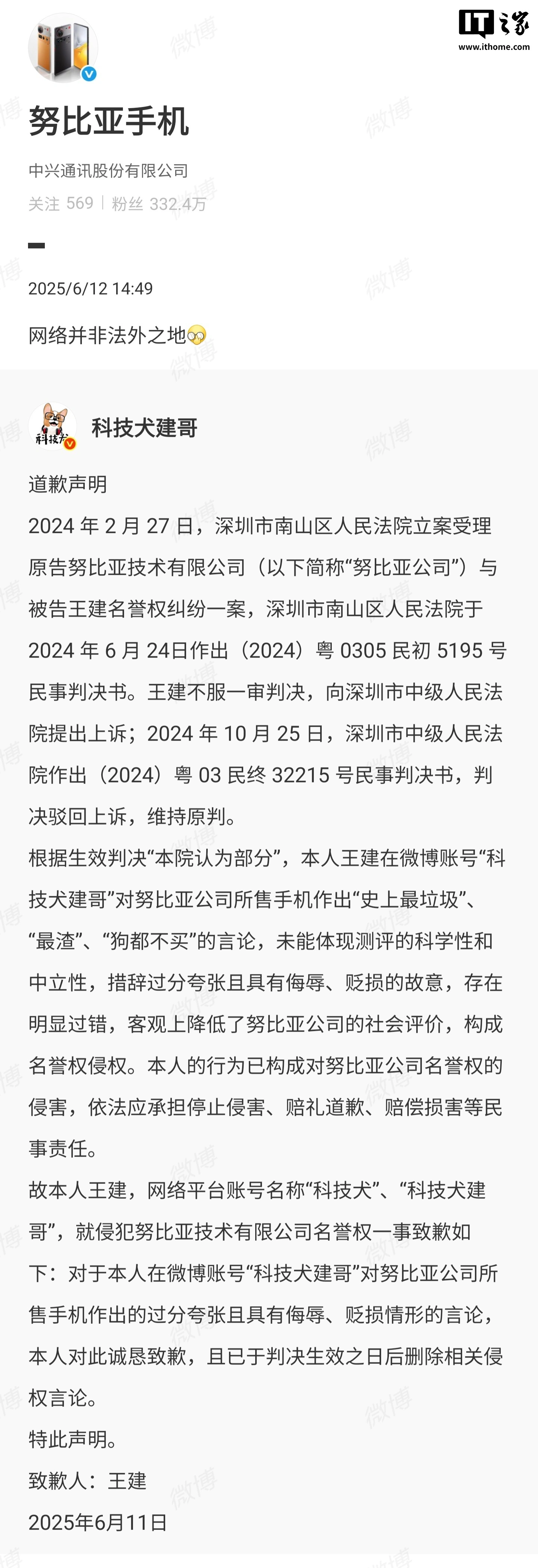 IT之家 6 月 12 日消息,博主 @科技犬建哥 昨晚发布道歉声明,就侵犯努比亚技术有限公司名誉权一事致歉,努比亚官方进行了转发。