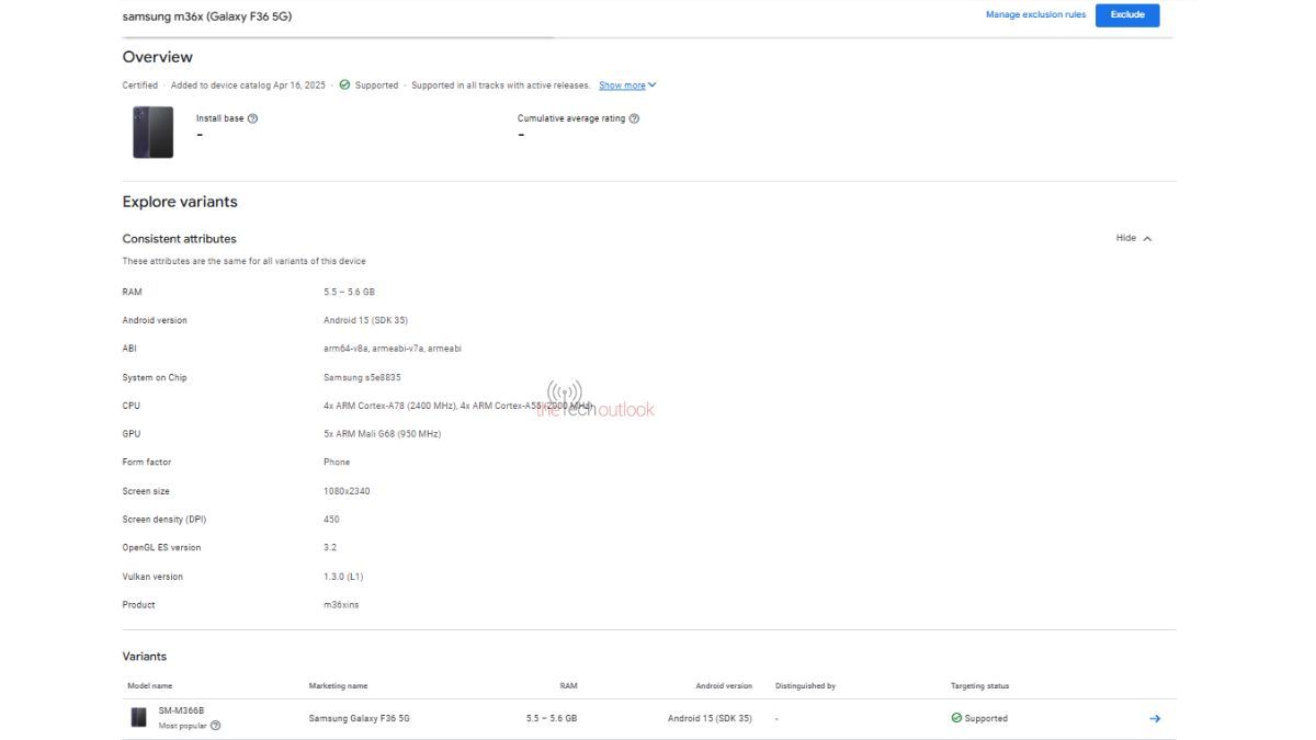 IT之家 6 月 13 日消息,科技媒体 The Tech Outlook 今天(6 月 13 日)发布博文,报道称在 Google Play Console 数据库中,发现了三星 Galaxy F36 手机的踪迹,显示该机配备 Exynos 1380 芯片。