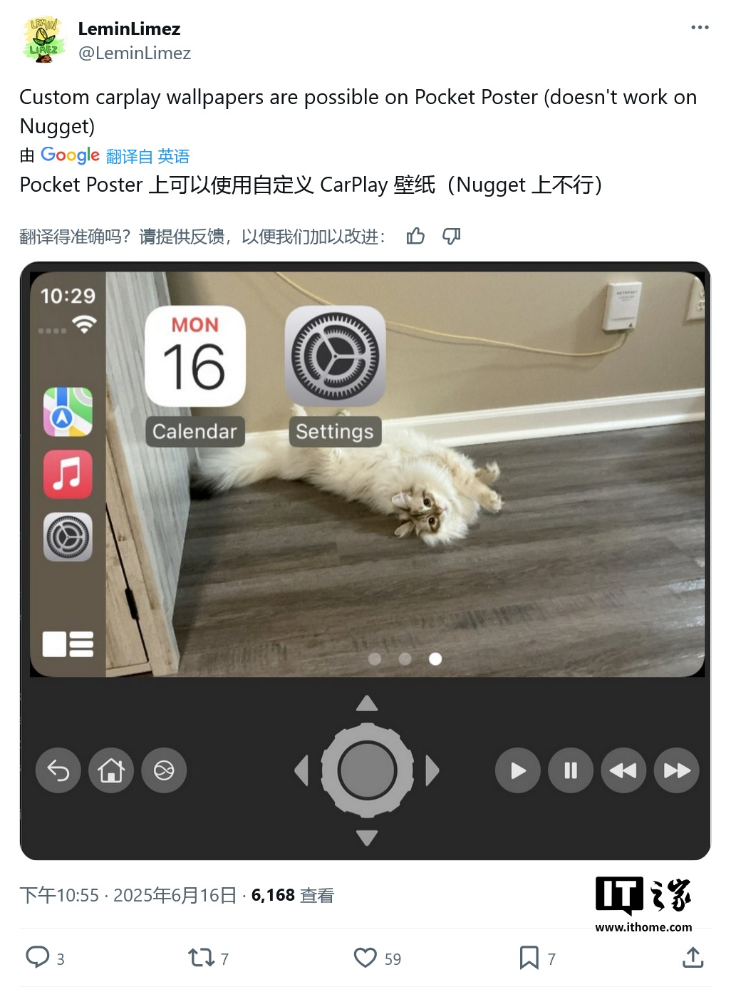 IT之家 6 月 17 日消息,开发者 LeminLimez 昨日(6 月 16 日)在 𝕏 平台发布推文,称在无需越狱的情况下,用户可以通过 Pocket Poster 应用,自定义 CarPlay 壁纸。