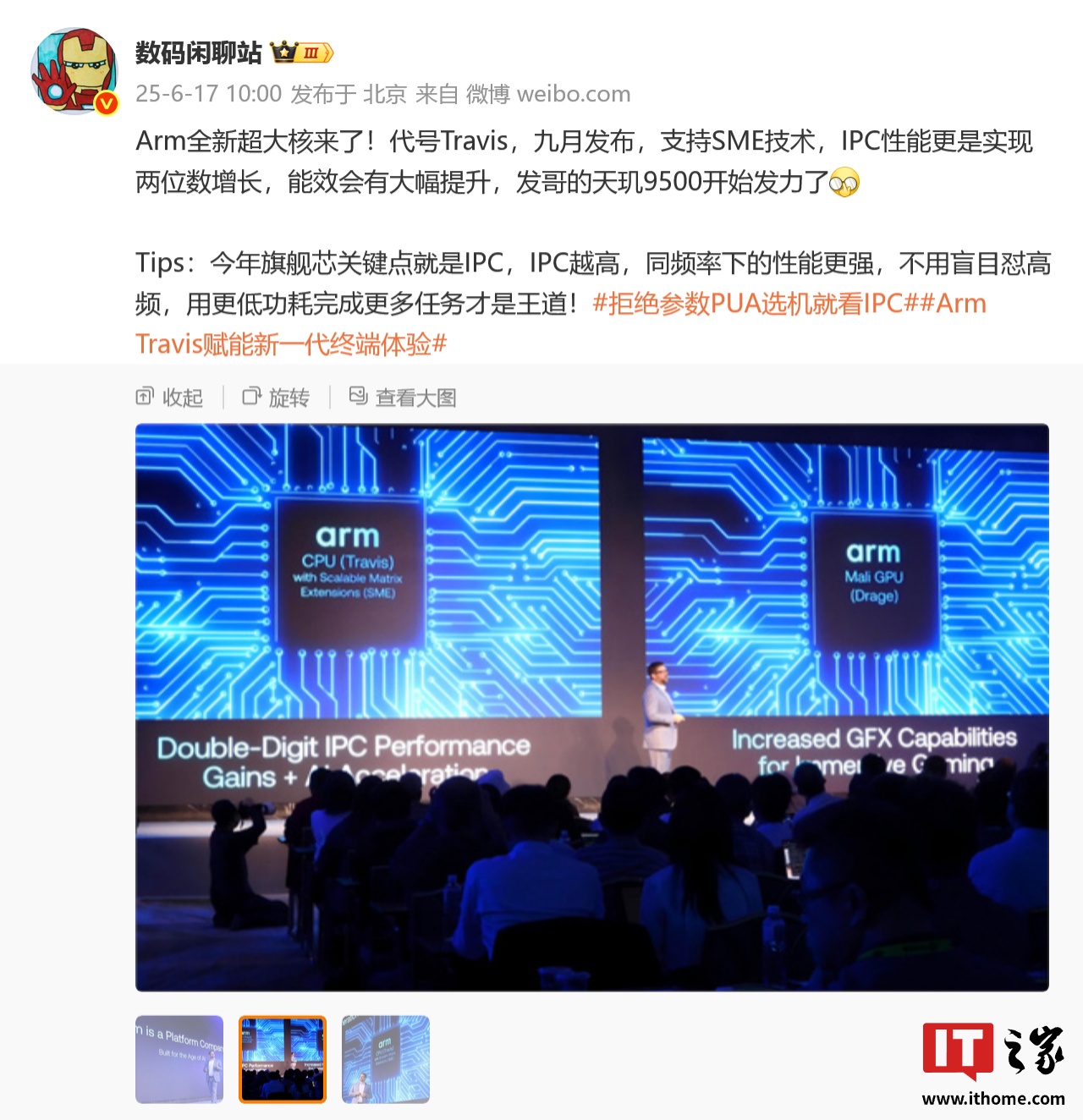 IT之家 6 月 17 日消息,消息博主 @数码闲聊站 今日上午表示,代号为 “Travis” 的 Arm 新一代“超大核”CPU IP 将于 9 月发布。按一般惯例预测,Arm 有望同期推出新一代“大核”CPU IP 和 GPU IP。