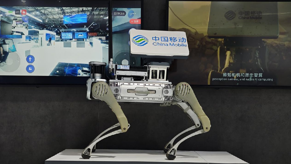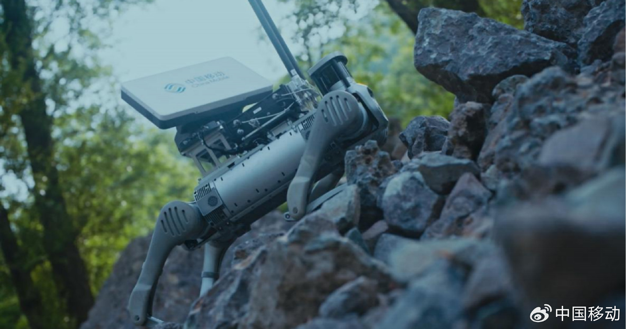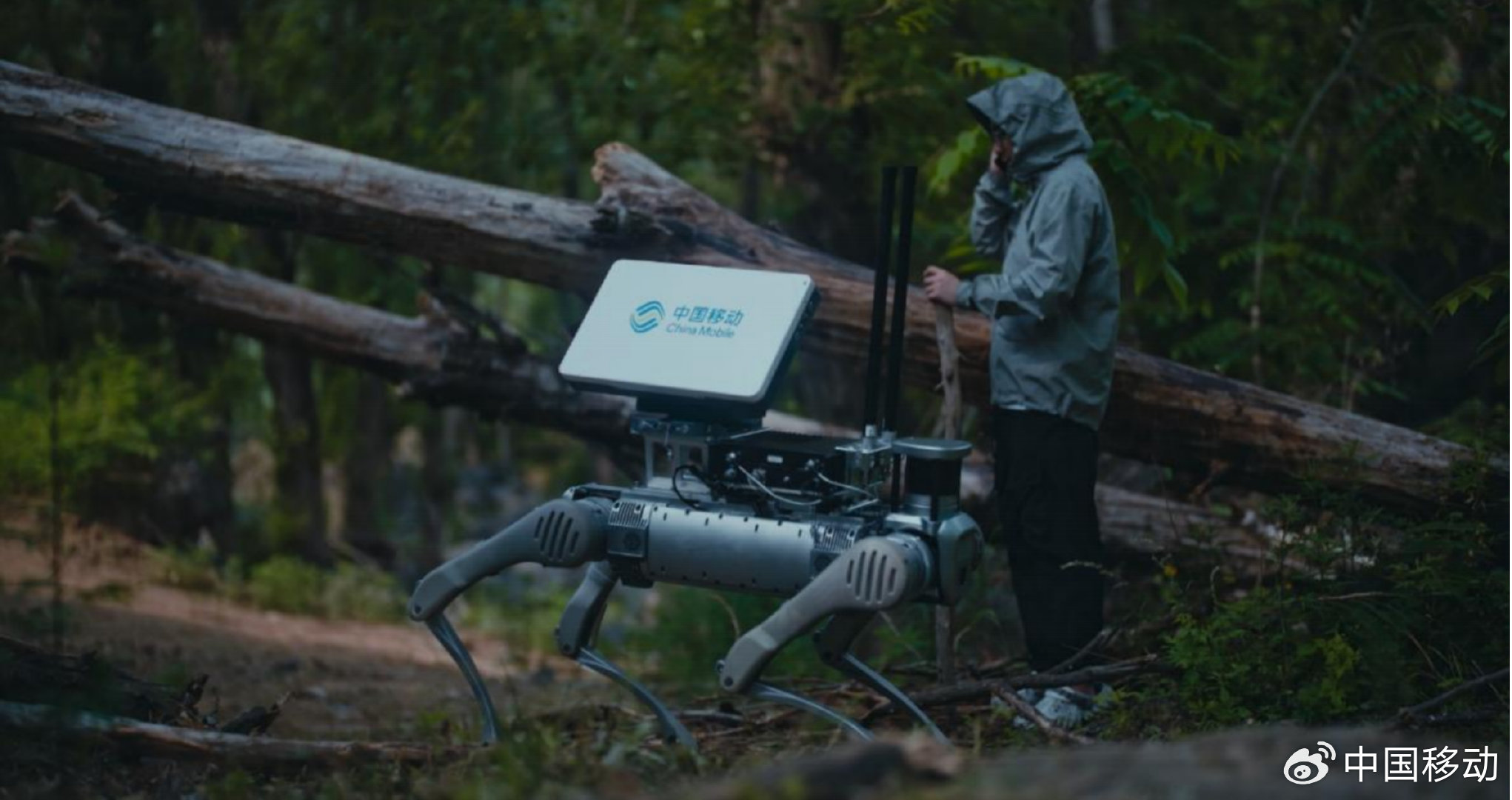 中国移动“智星犬”智能卫星通信机器狗通过卫星通信与搭载的基站深度融合,为被困群众提供应急移动通信服务;