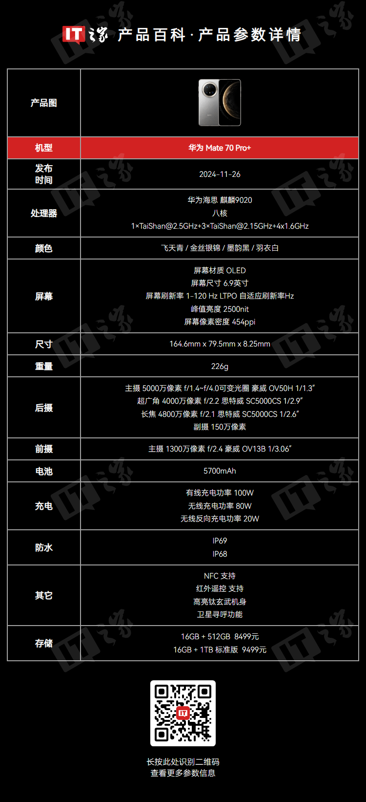华为 Mate70 Pro+ 发布于 2024 年 11 月 26 日,16GB+512GB 售价 8499 元。