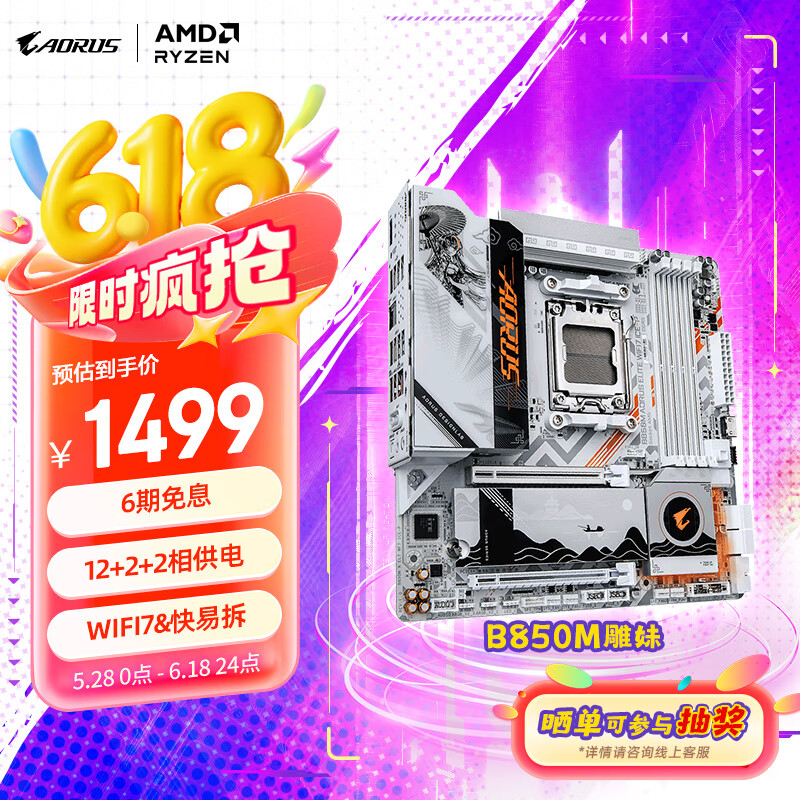 618 期间,技嘉 B850M AORUS ELITE WIFI7 ICE-P 雕妹主板正在热销中,京东平台到手价 1499 元,搭配 CPU 一起的套装更加实惠,支持 6 期免息分期,有需求的小伙伴赶紧加购下单吧。
