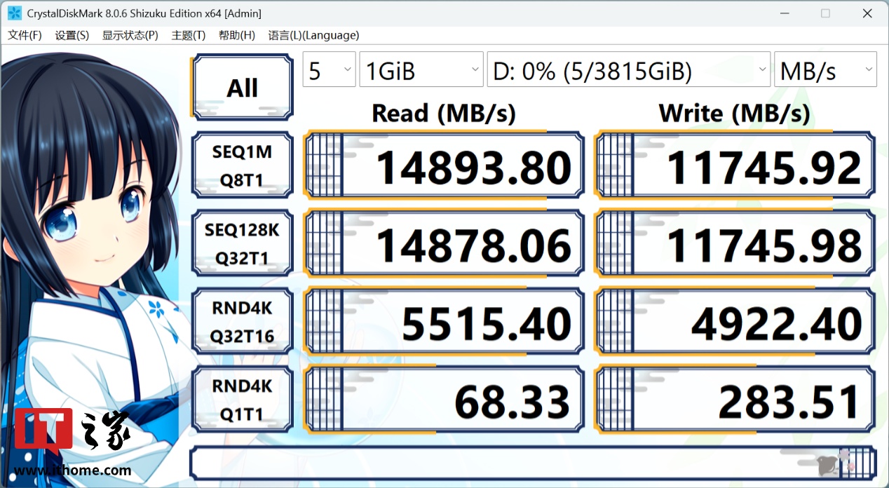 硬盘方面,我们在主板自带的 PCIe5.0 M.2 插槽上安装了标注规格为 14000MB/s 顺序读取速度和 11000MB/s 顺序写入速度的 PCIe5.0 固态硬盘,在 CDM 的跑分测试中跑到了 14893MB/s 的顺序读取速度和 11745MB/s 的顺序写入速度,符合其应有表现。