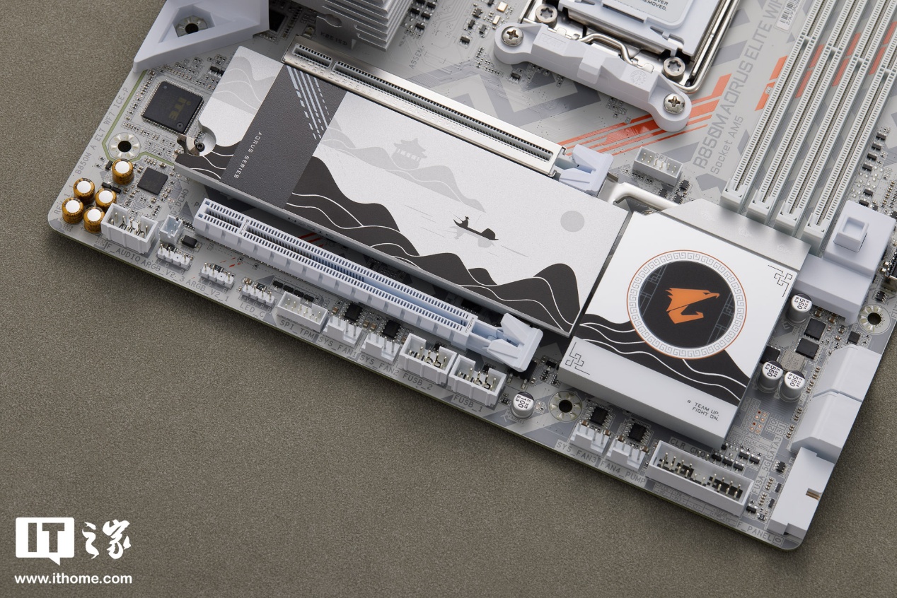 底部 M.2 装甲和南桥装甲上印着意境悠远的水墨风格山水画以及橙色雕头 Logo,南桥装甲下方周围还有一圈 RGB 灯带。这种“乱炖”风格的二次元国风设计,通过黑白水墨巧妙融合,又加入了零星橙色点缀出的电竞感,观感非常奇妙。