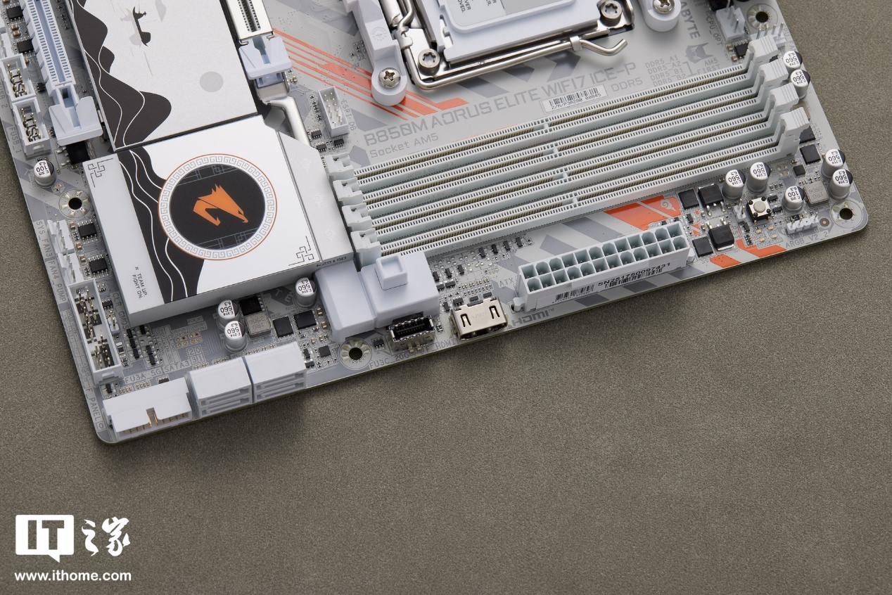 CPU 插槽右侧配备 4 条白色的 DDR5 内存插槽,最高支持 8200MT/s 频率,还有技嘉 D5 内存黑科技加持,也支持 AI 超频。