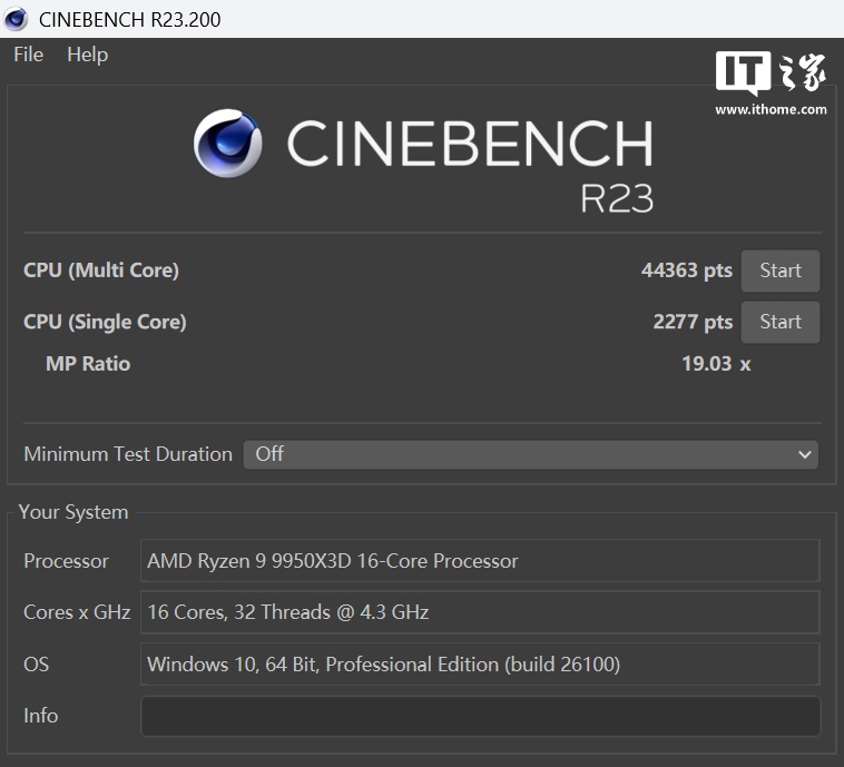 在 CineBench R23 的测试中,锐龙 9 9950X3D 跑出了单核 2277 分,多核 44363 分的成绩,这个表现和 X870 旗舰主板的跑分非常接近。