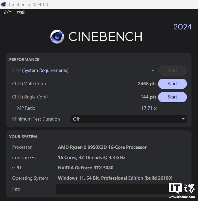 在 CineBench R24 的测试中,锐龙 9 9950X3D 跑到了单核 144 分,多核 2468 分的成绩,也与 X870 旗舰主板的表现相差无几。