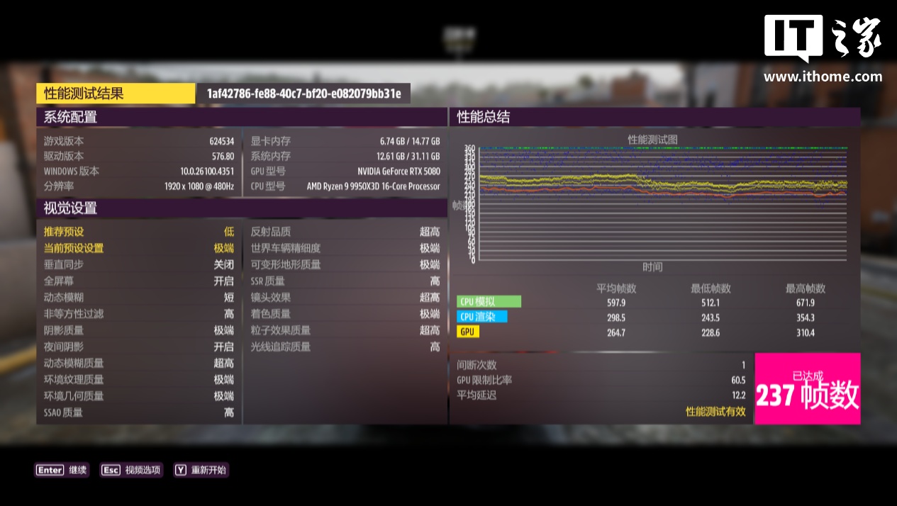 第三款是赛车竞速游戏《极限竞速:地平线 5》,以 1080P 分辨率 + 极端画质,运行游戏自带基准测试,锐龙 9 9950X3D 的游戏平均帧数为 237 帧,1% Low 帧为 175 帧。