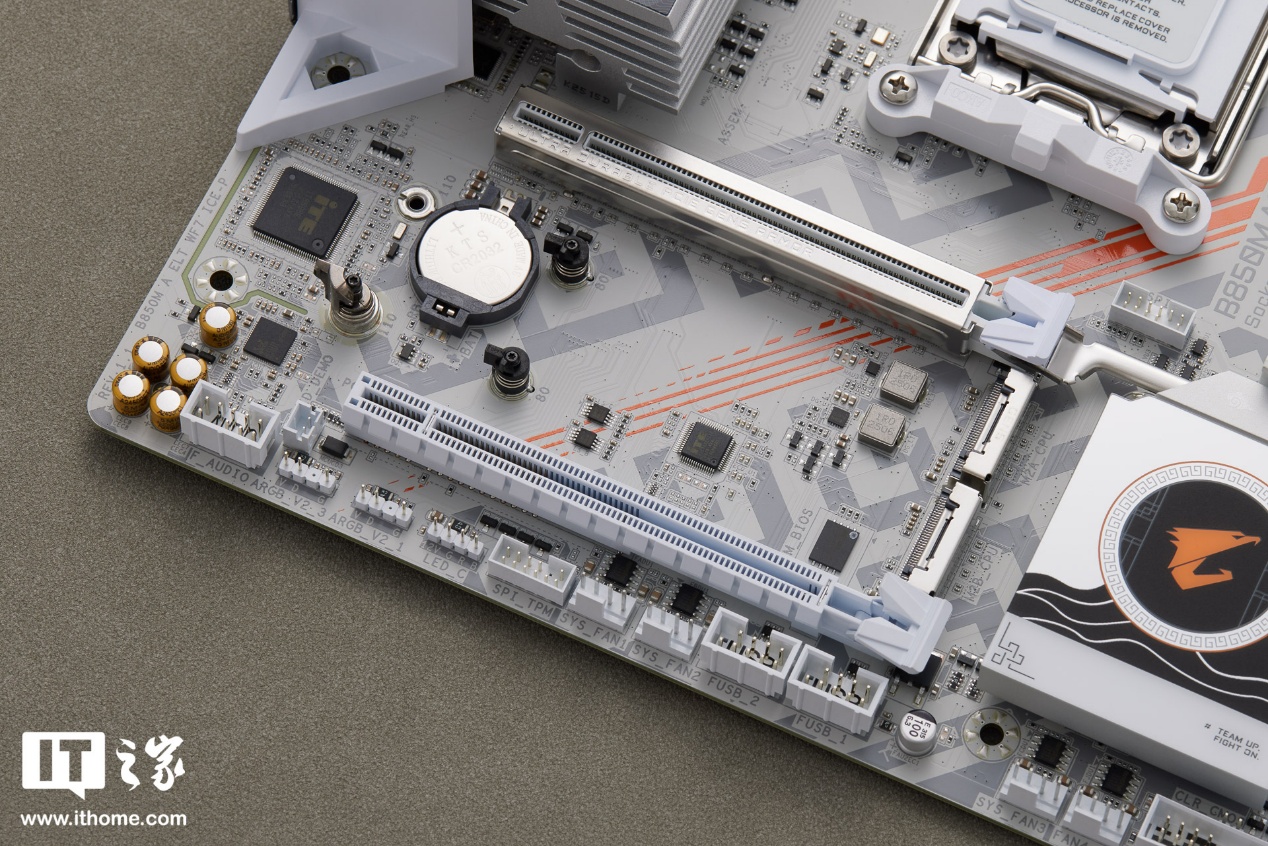 技嘉 B850M 雕妹主板提供 2 个 M.2 插槽(1*PCIe5.0 +1* PCIe4.0),主 PCIe5.0 x16 显卡插槽做了铝合金加固处理,另一条 PCIe4.0 插槽也是全长度设计。