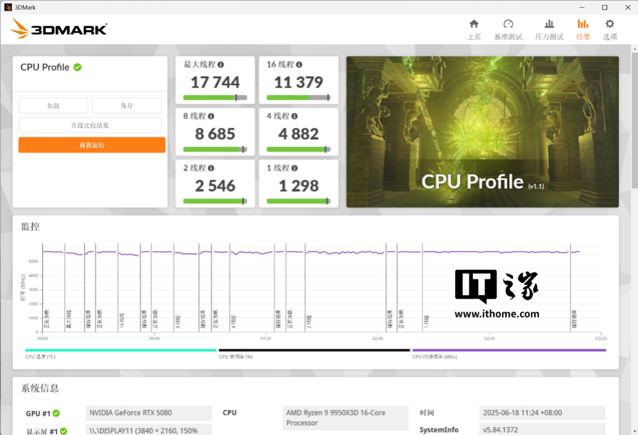 在 3D Mark CPU Profile 的测试中,锐龙 9 9950X3D 的最大线程分数为 17744 分,单线程分数为 1298 分,其单线程表现甚至比IT之家之前测试过的 X870 旗舰主板更好。