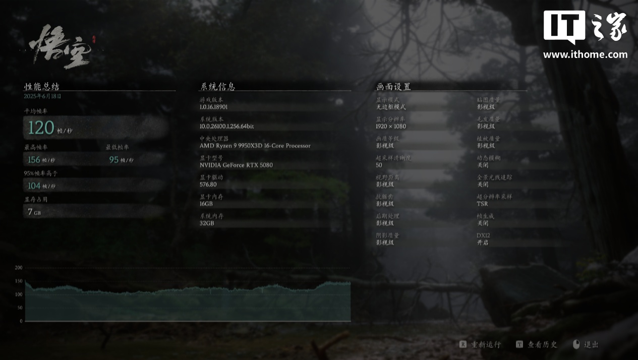 第五款游戏《黑神话:悟空》,以 1080P 分辨率 + 影视级画质 + 50% 超采样 + TSR,运行游戏自带基准测试,锐龙 9 9950X3D 的游戏平均帧数为 120 帧,1% Low 帧为 96 帧。