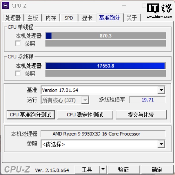 首先是 CPU-Z 的测试,锐龙 9 9950X3D 在该环节中获得了 870 分的单线程分数以及 17553 分的多线程分数。单核成绩相比 X870 旗舰主板略低 20 多分,多核成绩略低 50 多分,表现还是比较不错的。