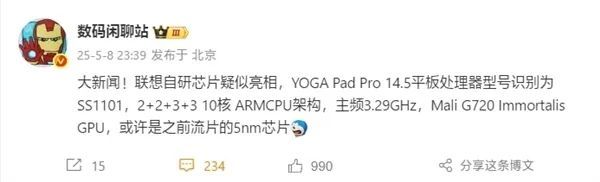 而这次的SS1101芯片,正是联想YOGA Pad Pro 14.5平板上首发搭载,与此前消息相符。