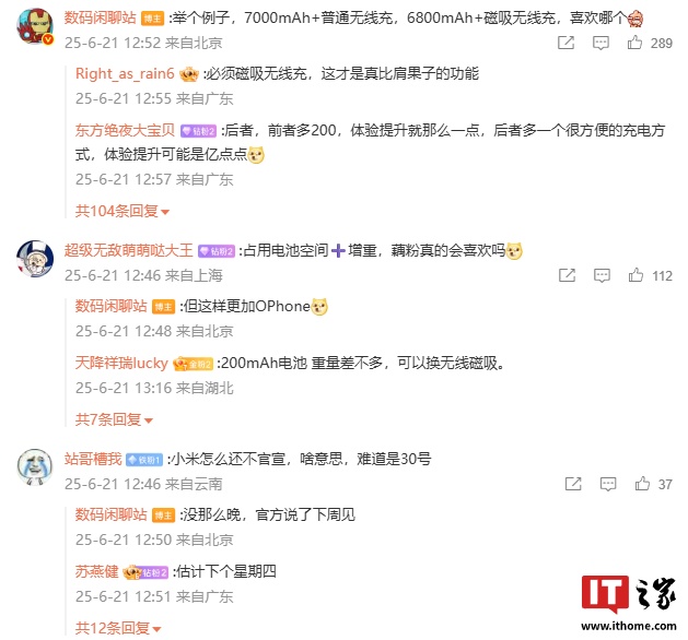 博主在评论区中列举了两个方案:“7000mAh + 普通无线充”和“6800mAh + 磁吸无线充”。由此来看,OPPO 磁吸充电的新方案会牺牲少量电池容量。