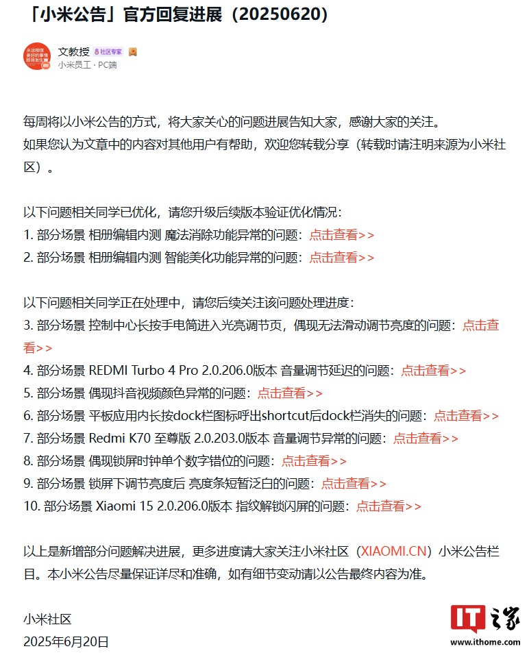 IT之家 6 月 22 日消息,小米员工本周(6 月 20 日)在小米社区发布公告,对小米澎湃 HyperOS 问题处理进展进行公布,其中提到了相册编辑内测问题优化情况,以及小米 15、REDMI Turbo 4 Pro、K70 至尊版手机已定位待处理的问题。