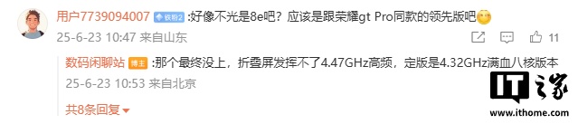 值得一提的是,该博主早些时候爆料称该机搭载 4.47GHz 的骁龙 8 至尊领先版处理器,而最新爆料却替换成了骁龙 8 至尊版处理器。对此,该博主解释称:“那个最终没上,折叠屏发挥不了 4.47GHz 高频,定版是 4.32GHz 满血八核版本”。