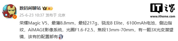IT之家 6 月 23 日消息,博主 @数码闲聊站 今日曝光荣耀 Magic V5 折叠屏手机的主要规格,该机将于 7 月 2 日发布,号称“全球最轻薄折叠屏手机”。