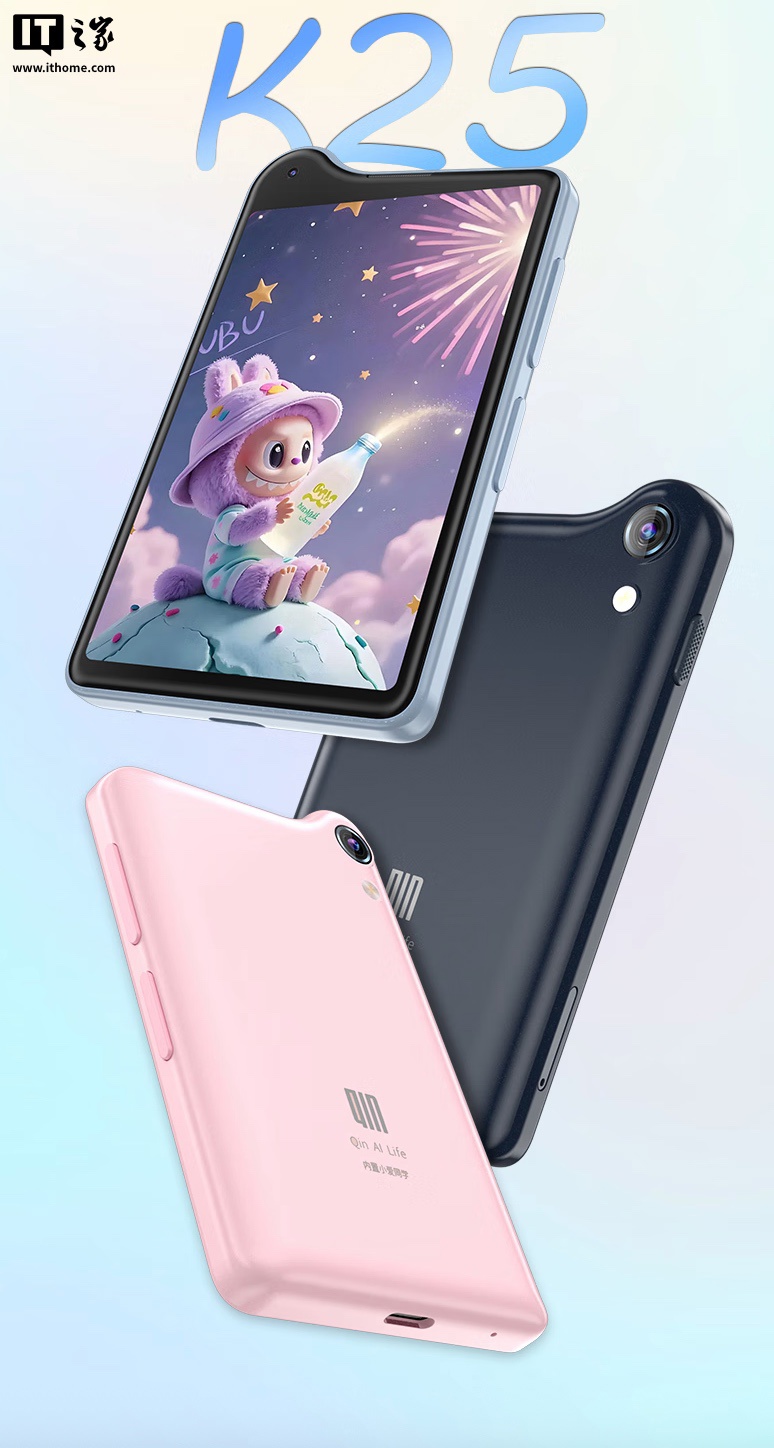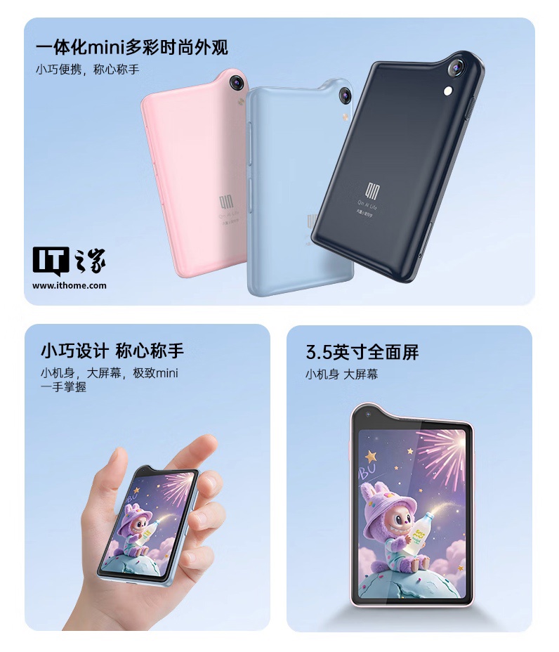 该机采用“单侧猫耳”异形设计,可选蓝粉黑三色,配备一块 3.5 英寸 LCD 面板,提供 8MP 后置摄像头,搭载 2150 毫安时电池,支持 10W 充电。