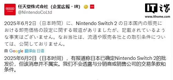 IT之家 6 月 2 日消息,任天堂官方今日发文,辟谣了彭博社关于 Switch 2 日本市场批发价被曝光的新闻,并表示任天堂不会披露任何与分销和零售合作伙伴的业务信息。