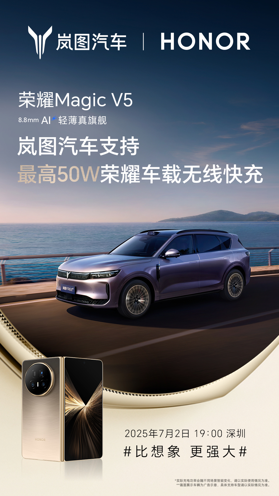 IT之家 7 月 2 日消息,岚图汽车官方今日发文宣布,其支持荣耀 Magic V5 旗舰折叠屏手机最高 50W 的荣耀车载无线快充。