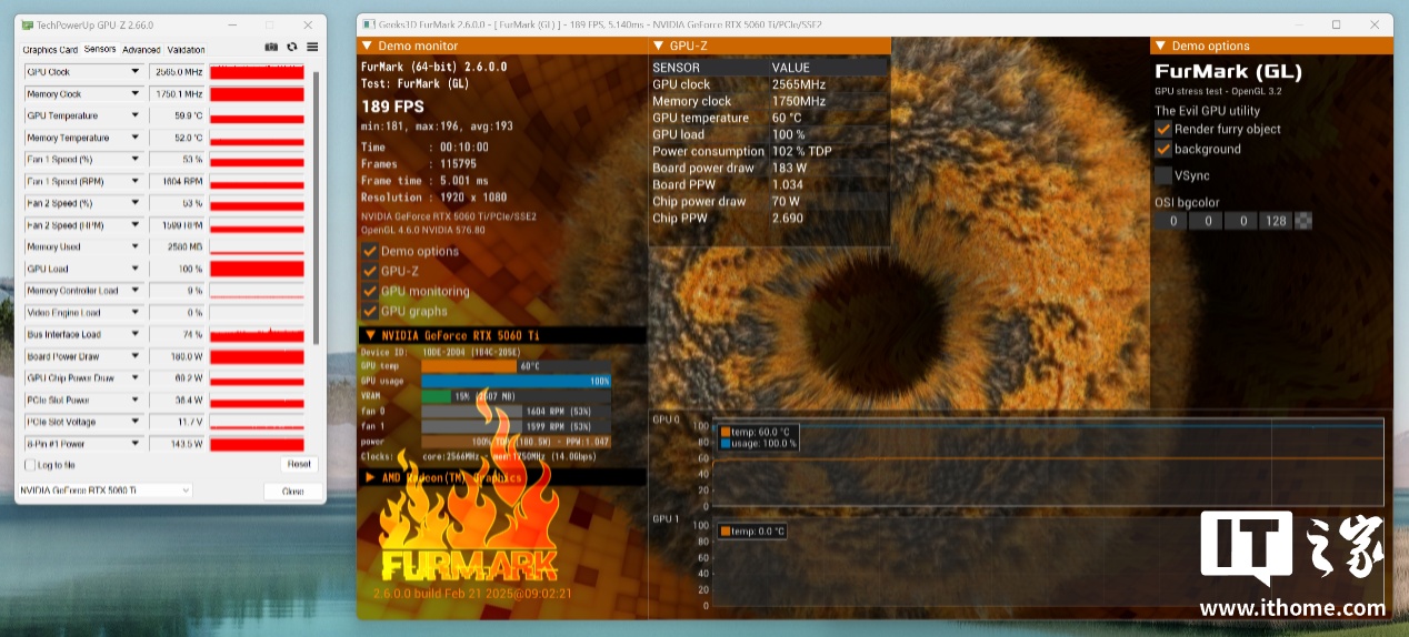 实际散热表现我们直接通过 FurMark 烤机进行验证,经过 10 分钟烤机后,GPU 温度仅有 59.9℃,显存温度低至 52℃,是IT之家评测过的 RTX 5060 Ti 显卡中,温度表现最好的一张卡。烤机过程中 GPU 频率也保持在 2565MHz,功耗维持在 180W,充足的散热堆料让影驰 GeForce RTX 5060 Ti 星曜 NOX OC 显卡在满载场景下,依旧能够提供满血的功耗输出,并且温度凉爽。