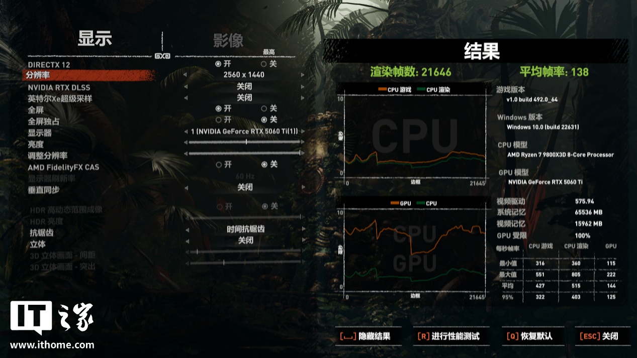 RTX 5060 Ti 在 2K 分辨率 + 最高画质下,游戏平均帧数 138 帧,1% Low 帧 72 帧;