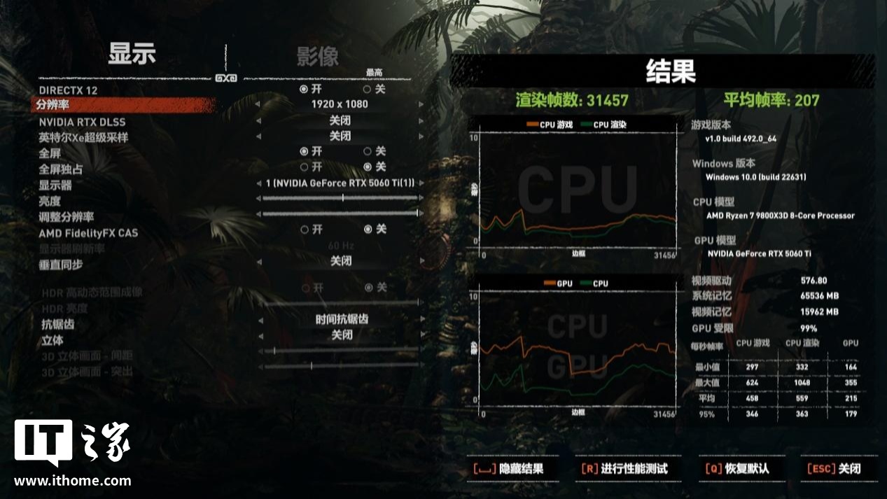 RTX 5060 Ti 在 1080 分辨率 + 最高画质下,游戏平均帧数 207 帧,1% Low 帧 164 帧;