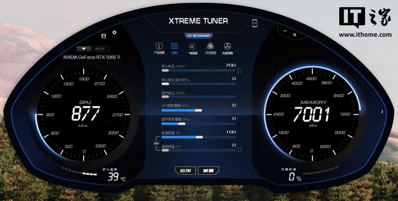 它的界面采用经典仪表盘风格设计,蓝黑配色,用过其它超频工具的小伙伴应该对这套交互不陌生。仪表盘左右两侧的刻度表分别显示当前 GPU 的实时核心频率和显存频率,下方还有核心温度和显卡风扇转速信息。